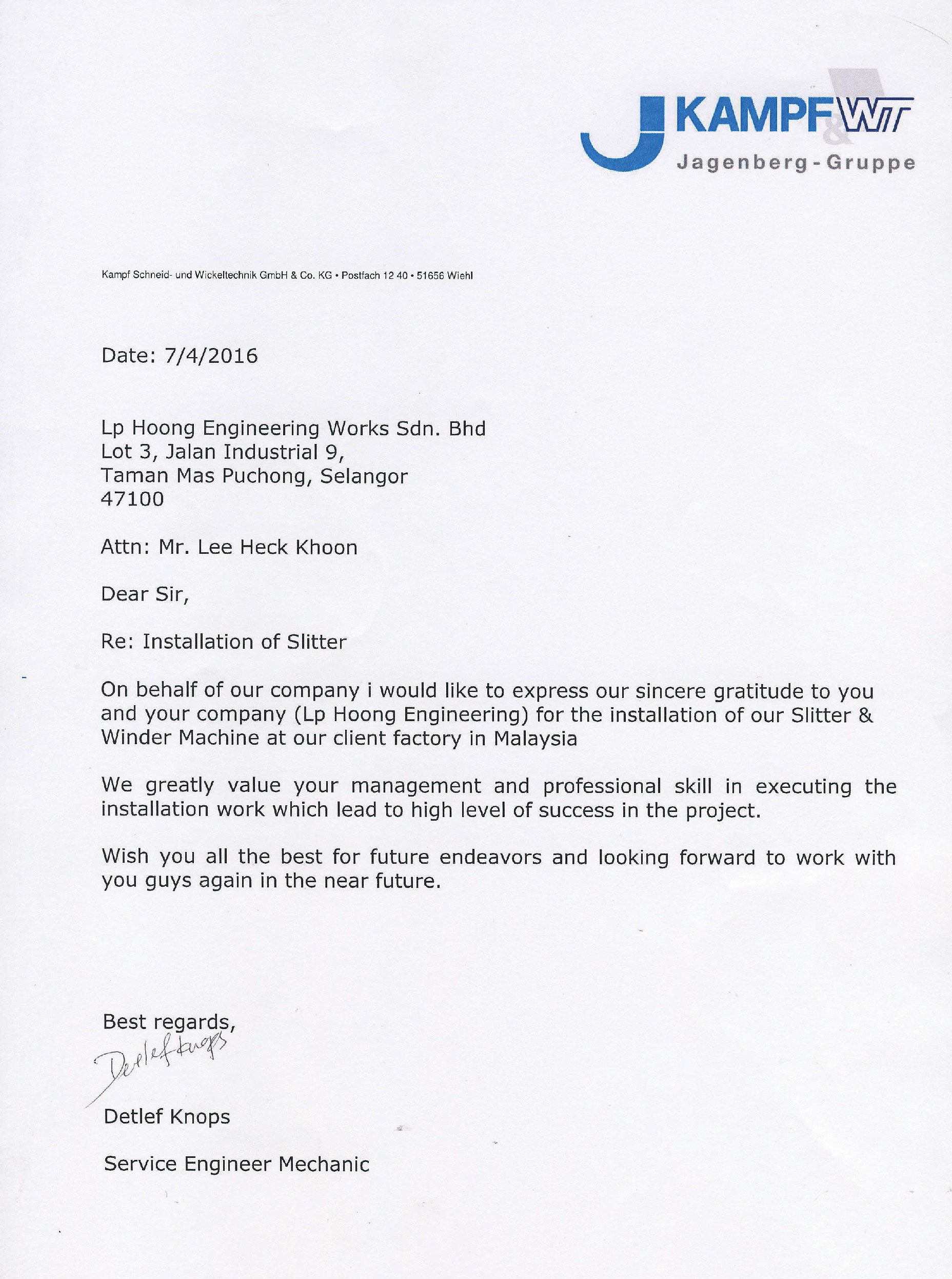LP Hoong Certificate from Jagenberg